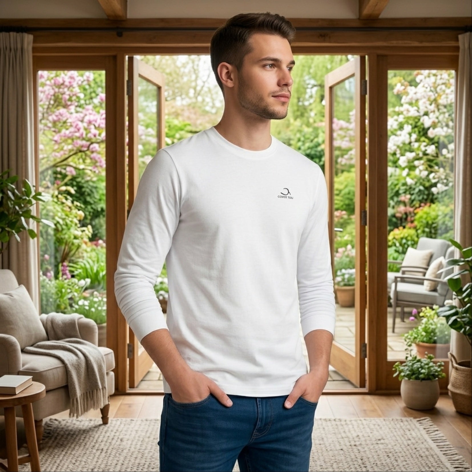 Le T-shirt manches longues en 100% coton peigné biologique, d'une douceur rare. Son grammage 180 g/m² lui confère un tombé premium et une durabilité qui se ressent dès le premier toucher.